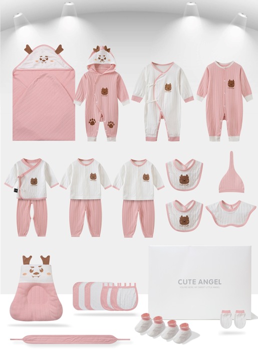 اللون الوردي الناعم يضيف لمسة من البراءة والدلال، والبكج يحتوي على تشكيلة متنوعة تشمل أساسيات المواليد بلمسة فاخرة.